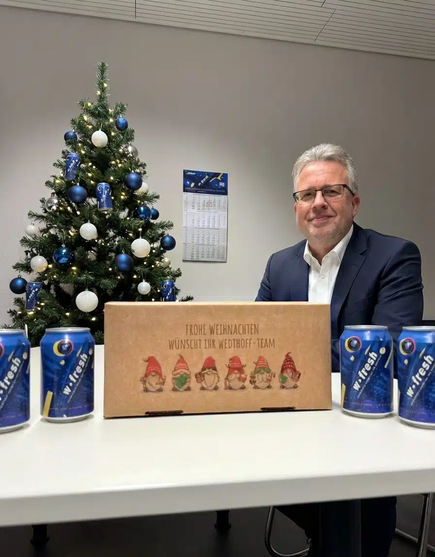 Zum Jahresende wollten wir etwas tun, das persönlicher ist als ein Standardgruß. Also haben wir eigene Wedthoff-Cola-Mix-Getränkedosen gestaltet – und wie jedes Jahr kleine, persönlich zusammengestellte Geschenke an Kunden, Partner und Wegbegleiter ausgeliefert … mehr noch: überbracht.